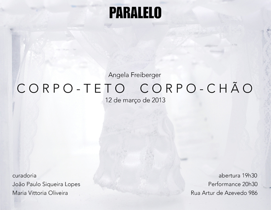 A conceptual work involving the body as main support will be presented at Paralelo Gallery in São Paulo. This is Body-floor Body-ceiling, an unprecedented performance conceived and performed by Angela Freiberger. The performance lasts one hour and is part of the exhibition of the same name that also brings Freiberger photographs and sculptures curated by João Paulo Siqueira Lopes and Maria Vittoria Oliveira. In performance, Angela is sustained by a structure made of white fabrics, and interacts with the audience through questions “materialized” in wool and paper. On occasion she will wear a dress with tail over 2.5 m in length, which brings inside it the single beam of light that shines the gallery.