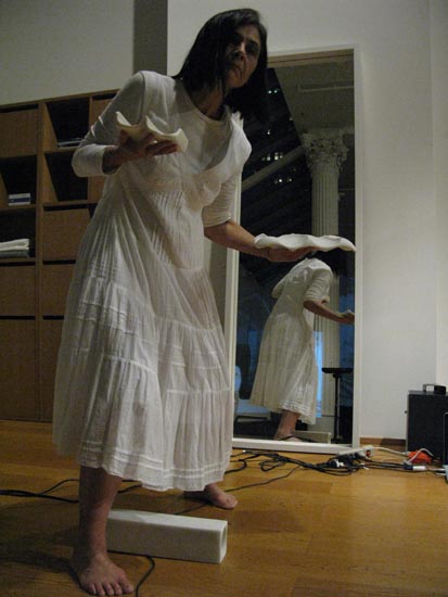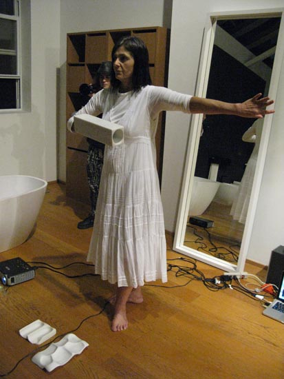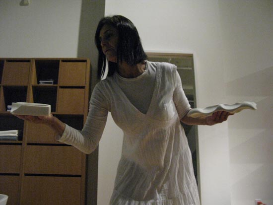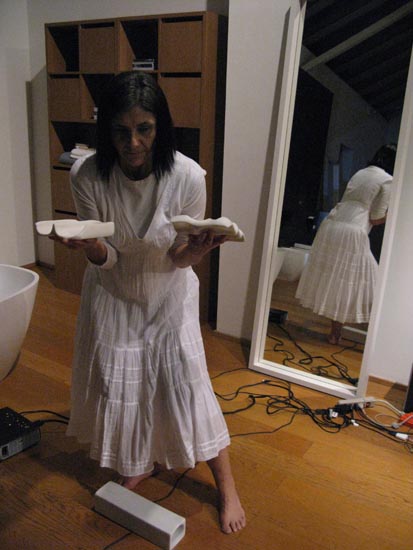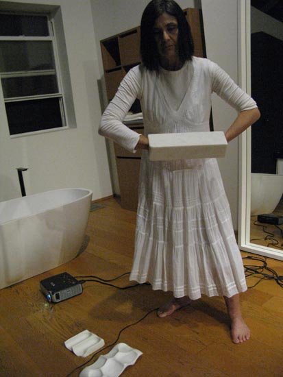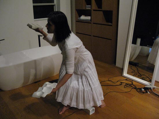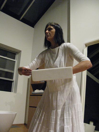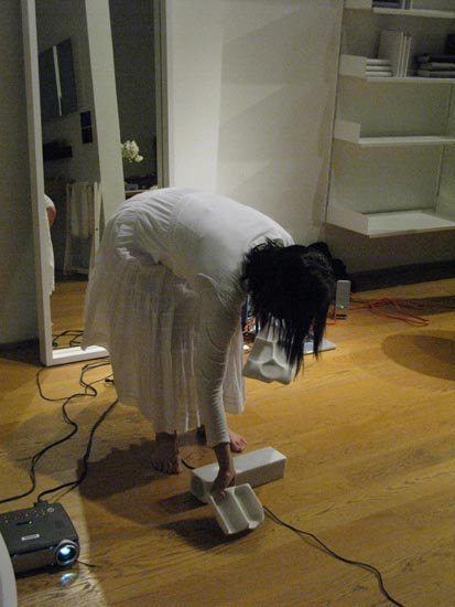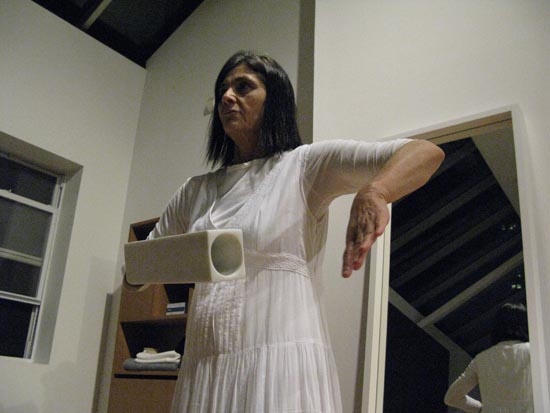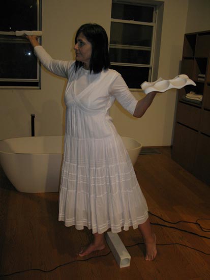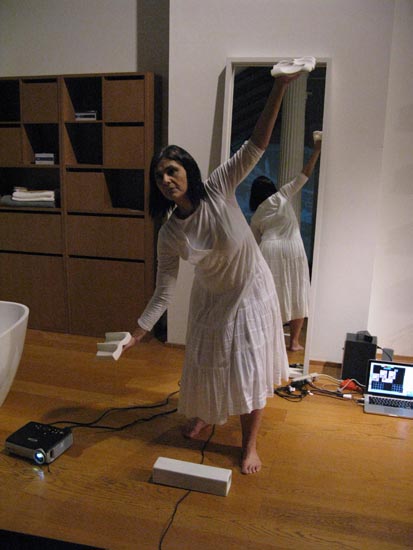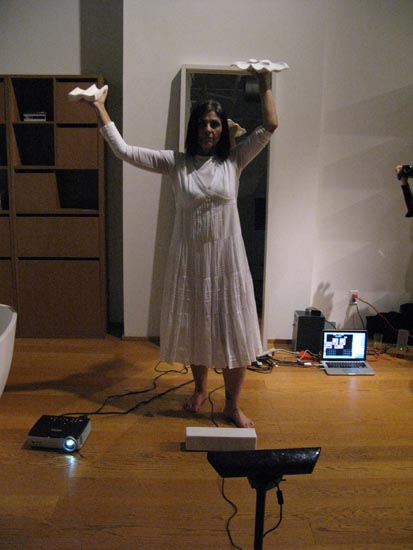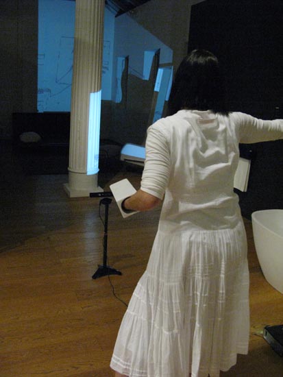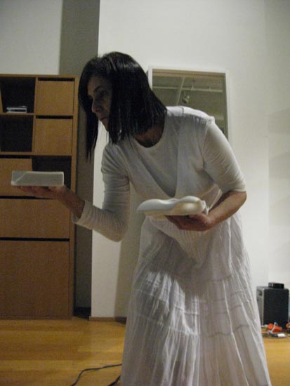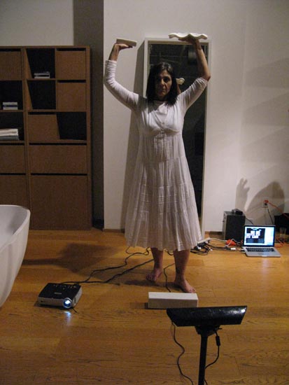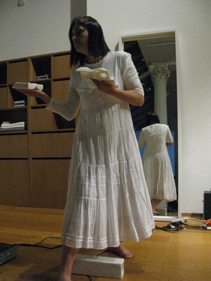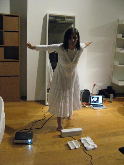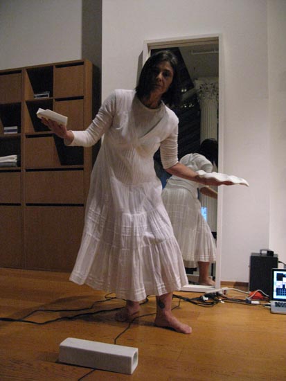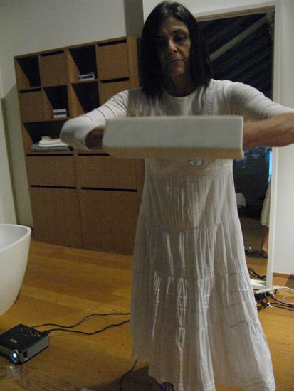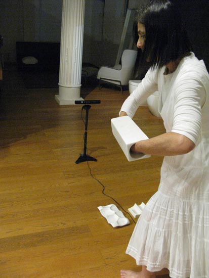 A performance at Studio Anise of Angela Freiberger collaboration with Phillip Baldwin and Laurie Altman’s composer score with marble sculpture, the kinetic in W, Y, Z with the visuals in an interactive series of sound and film triggers with the kinect controlling both sides of the performer body, she control pitch, speed and contract within X,Y and Z space. “Excavation of Emptiness” is the first experiment, work in progress. Photos by Gianina Jimenez Barrantes. Thanks for Paul Anis.