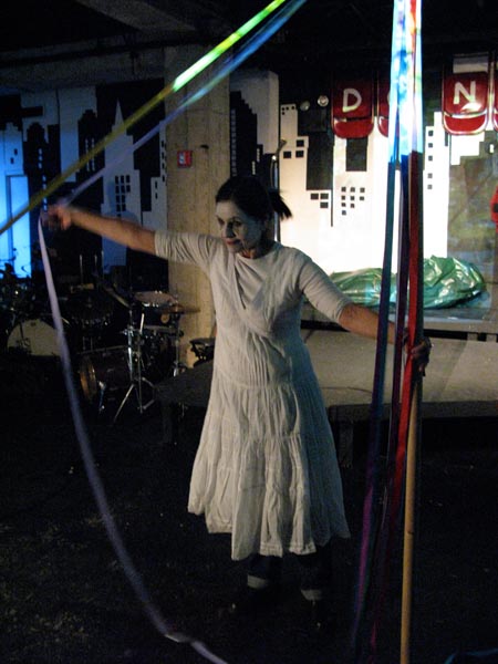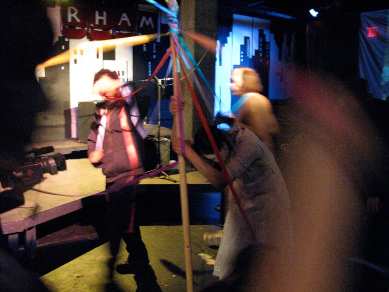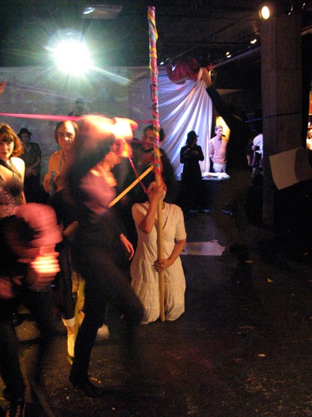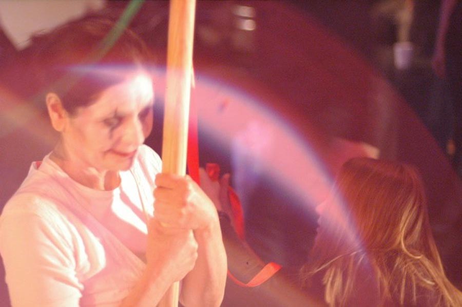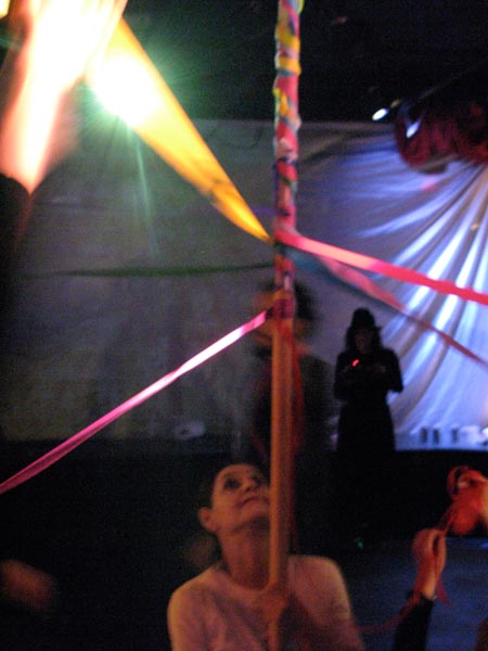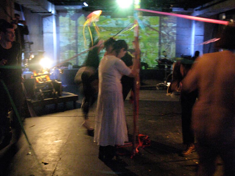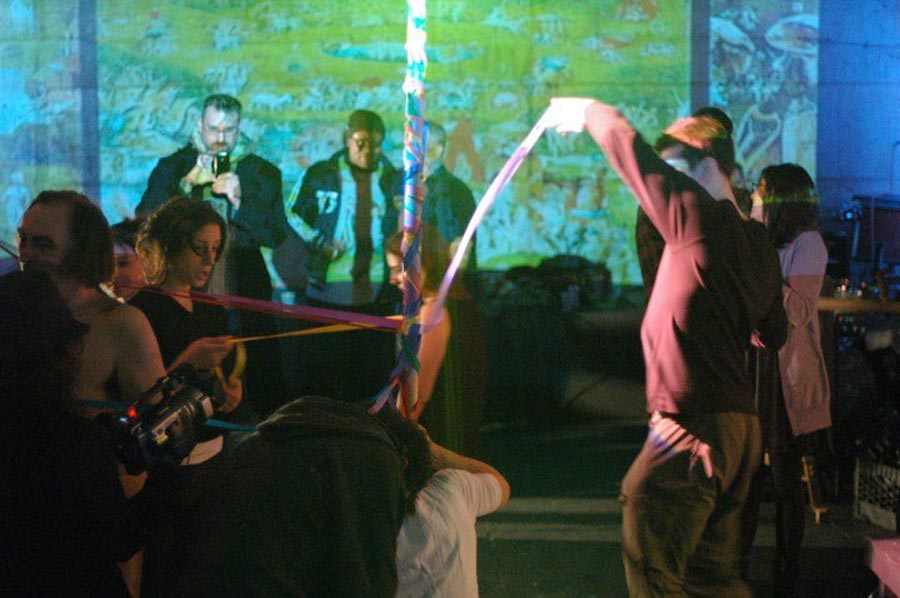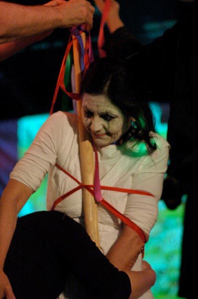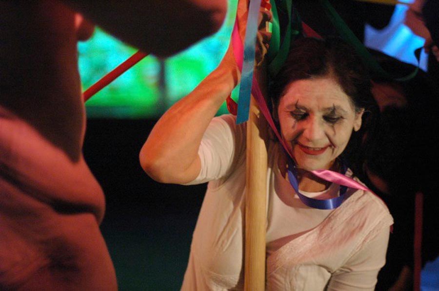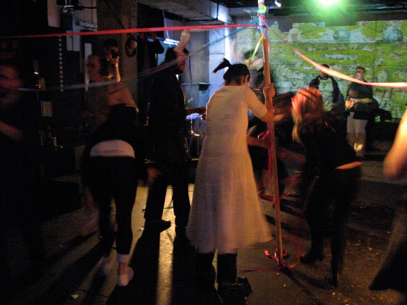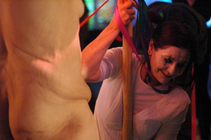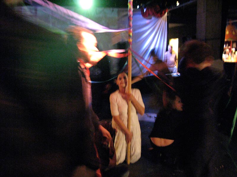 Performance for the Anarcho Art, Utopia’s Ghost in the Living Theatre, New York; dancing around a Maypole with the public participation. The artist is holding the pole as a joker.