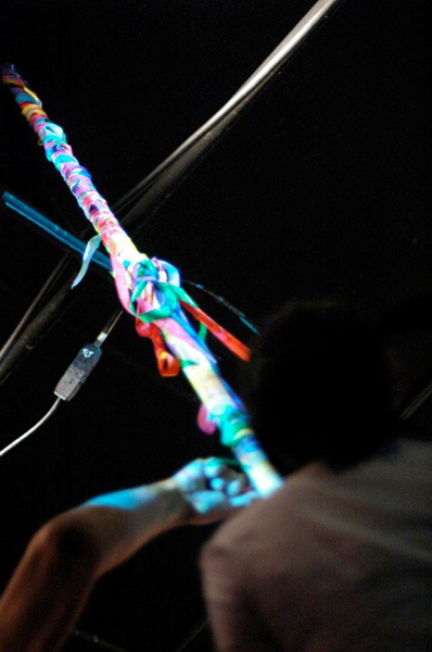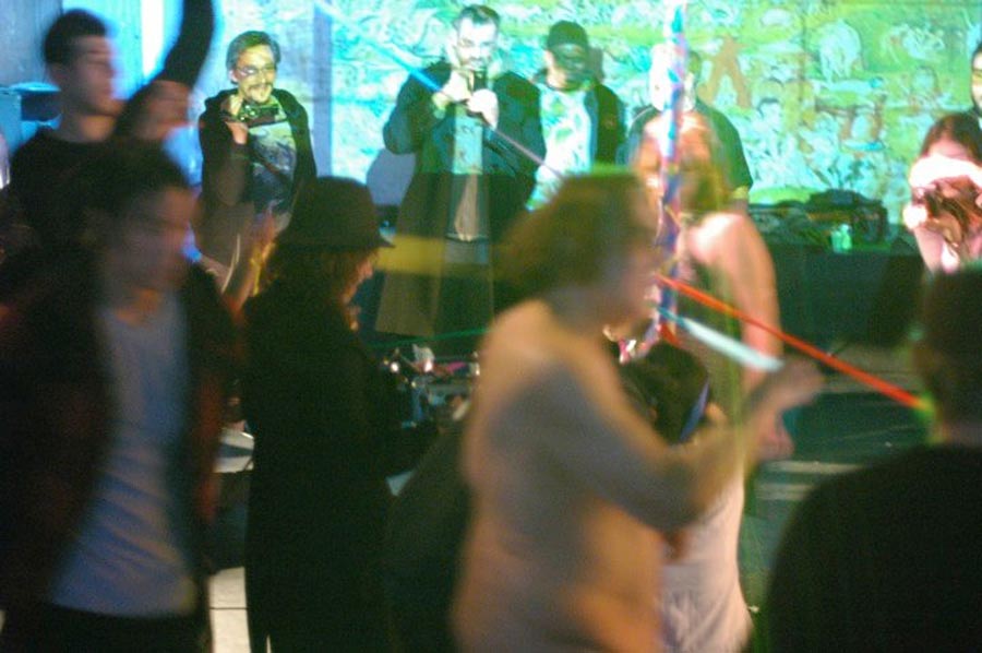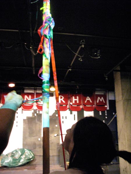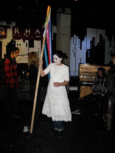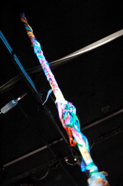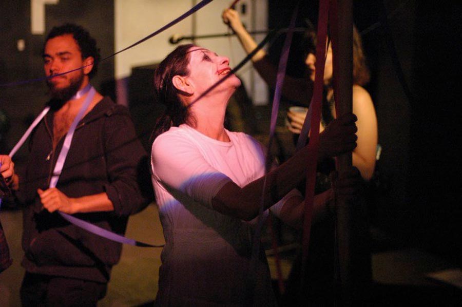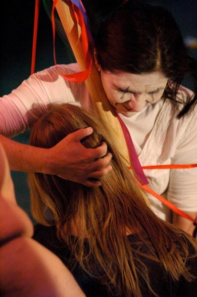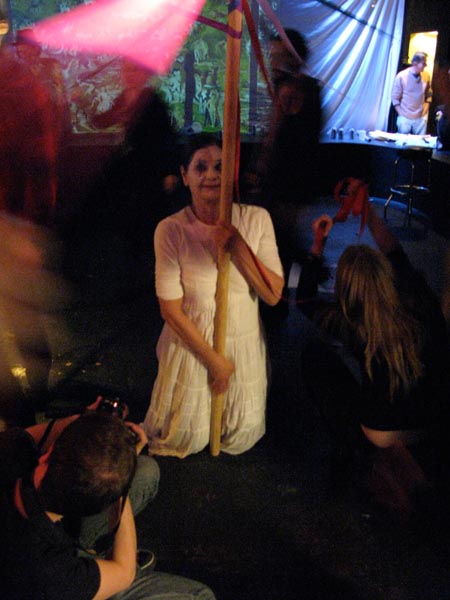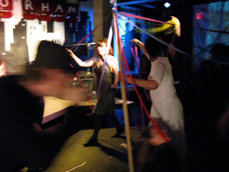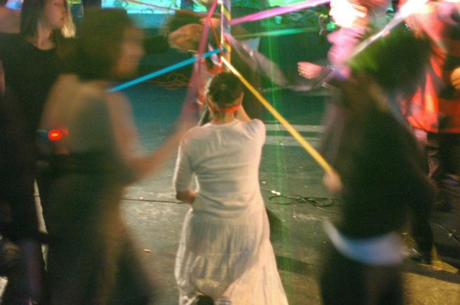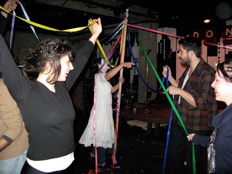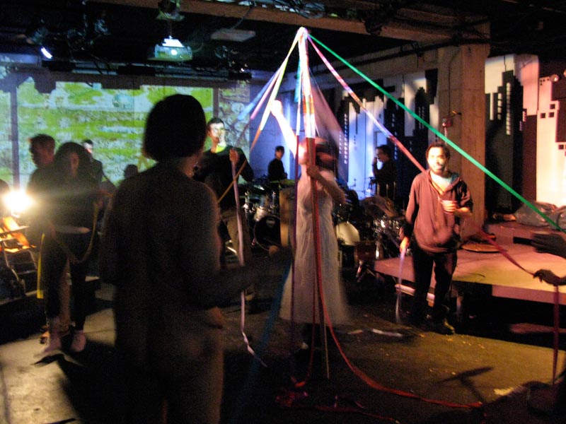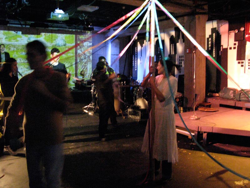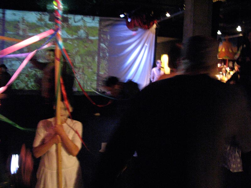 Performance for the Anarcho Art, Utopia’s Ghost in the Living Theatre, New York; dancing around a Maypole with the public participation. The artist is holding the pole as a joker.