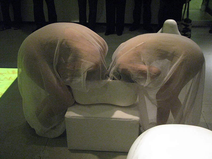 Performers Yana Kraeva and Jin Kang Park, 40 minutes performance on the opening exhibition. The body and the veil became an extension of the sculpture and vice-versa.