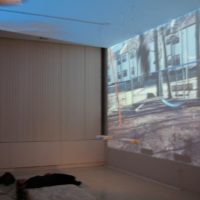 Angela Freiberger’video installation presents us with two views of a child swinging to and fro. The accompanying soundtrack plays bird song, the creak of the chains as the child swings, and a narrative about life processes and change. On the wall, we are presented with a back view of the child as she swings. An apartment complex, some trees, and the occasional bird are the only other elements in the scene. On the ceiling, we find a view from the child’s chin: The sky, trees, and the top of the swing-set move back and forth, slightly disorienting viewers. As we watch, it almost feels as if we are the ones swinging. (I even found myself rocking slightly as I a gazed up at the projection.) We might view this work as a commentary on situations we often find ourselves in, where we appear to be moving rapidly, but later we realize that we have gone nowhere.